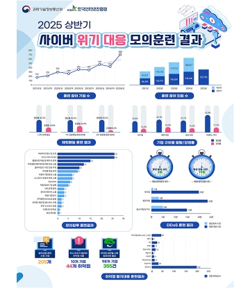 과학기술정보통신부는 18일 한국인터넷진흥원과 함께 '2025년 상반기 사이버위기 대응 모의훈련'을 지난달 중순부터 2주 동안 실시한 결과, 688개 기업 25만 5765명이 훈련에 참여해 역대 최다 참여 기업과 인원을 기록했다고 밝혔다.