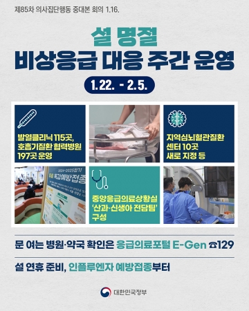 정부는 16일 제85차 의사 집단행동 중대본 회의를 열고 '설 연휴 대비 응급의료체계 유지 특별대책'을 논의했습니다. 1월 22일부터 2월 5일까지 2주간을 '설 명절 비상응급 대응 주간'으로 지정하고 응급의료를 안정적으로 유지할 수 있도록 대책을 적극 추진합니다.
