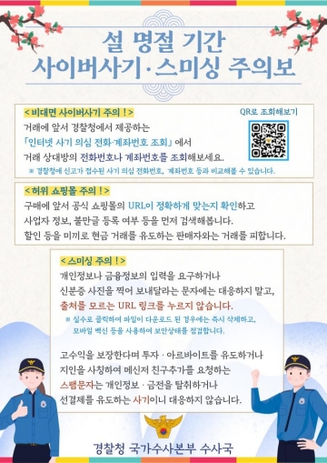 경찰청은 설 연휴 기간 전후 발생하는 문자사기(스미싱) 등 사이버사기 범죄에 대한 단속을 강화하고 피해 예방을 위해 누리집과 SNS 채널 등을 통해 예방수칙을 제공할 계획이다.