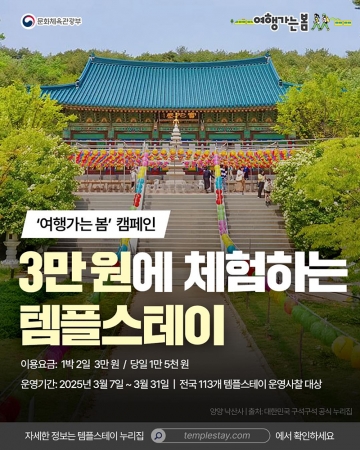 템플스테이를 운영하는 전국 113개의 사찰에서 3만 원으로 템플스테이를 체험하며 행복을 두 배로 느껴보세요!