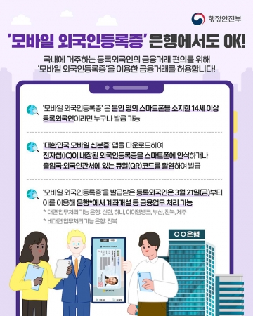 · '모바일 외국인등록증'을 발급받은 등록외국인은 3월 21일(금)부터 이를 이용해 은행*에서 금융업무 처리 가능