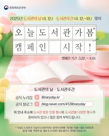 2025년 도서관의 날(4. 12.) 도서관주간(4. 12.~18.) 맞아 3. 22.(토)~ 4.18.(금)까지 온·오프라인으로 '오늘도서관가봄*' 캠페인을 진행합니다.