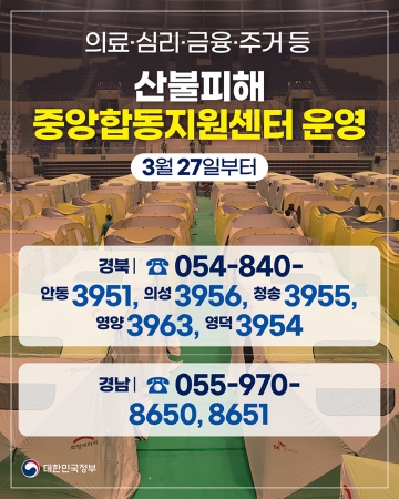 산불로 피해 입으신 분들이 하루빨리 일상을 회복할 수 있도록 3월 27일부터 경북과 경남 지역에 중앙합동지원센터를 운영합니다.