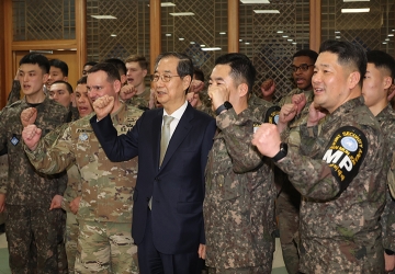 이후 한 권한대행은 JSA경비대대(캠프 보니파스)를 방문해 한국의 김태우 JSA경비대대장과 미국 블랭큰혼 유엔사경비대대장으로부터 부대 현황보고를 받고, 대대 복지회관으로 이동해 한미 장병들을 격려하는 시간을 가졌다.