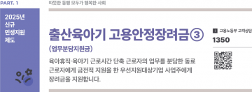 소속 근로자에게 육아휴직 또는 육아기 근로시간 단축을 허용하고, 업무를 분담한 동료근로자에게 보상을 지급한 사업주에게 육아휴직 등 사용 근로자 1인당 월 20만 원 지원