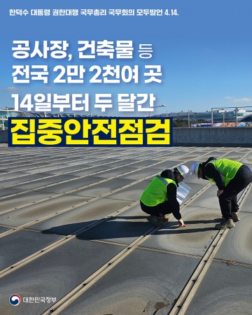 최근 안전사고가 발생하면서 국민들의 우려가 커지고 있습니다. 정부는 14일부터 6월 13일까지 두 달간 전국의 공사장, 건축물 등 사고 우려가 있거나 국민 관심이 높은 시설물 총 2만 2천여 곳에 대해 선제적으로 집중안전점검을 실시합니다. 사고는 예측하지 못한 곳에서 한순간의 방심으로 발생하는 만큼 정부는 비상한 각오와 책임감을 가지고 철저한 안전점검과 후속 조치에 최선을 다하겠습니다.