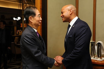 한덕수 대통령 권한대행 국무총리는 16일 오전 무역사절단과 함께 방한한 '웨스 무어(Wes Moore)' 美 메릴랜드 주지사와 조찬을 갖고 한-메릴랜드주 간 협력 방안을 포함한 한미관계에 대해 의견을 교환했다.