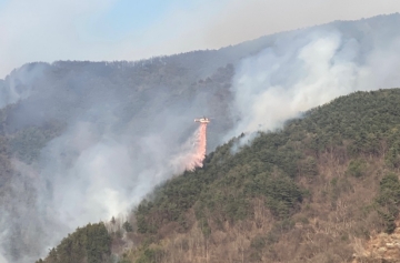 대구 북구 함지산 산불 발생 이틀째인 29일 산불 진화 헬기가 산불지연제(리타던트)를 투하해 불을 끄고 있다. (사진=산림청)
