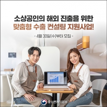 중소벤처기업부(장관 오영주, 이하 중기부)는 해외시장 진출에 어려움을 겪고 있는 소상공인을 위해 전문가 컨설팅을 지원하는 '소상공인 수출 컨설팅 지원사업'에 참여할 소상공인을 4월 30일(수)부터 모집합니다.