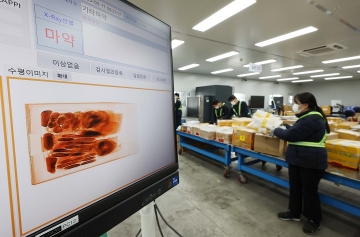 지난 3월 18일 인천 중구 인천공항세관 특송물류센터 검사장에서 관세청 직원들이 마약류 성분 함유 불법의약품 적발 급증에 따른 집중 단속 X-RAY 검사를 진행하고 있다.