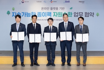 환경부는 15일 카카오, 씨제이대한통운, 매일유업, 한솔제지와 한솔제지 대전공장에서 종이팩 회수율을 높이기 위해 '온라인 플랫폼 활용 종이팩 회수 시범사업 업무협약'을 체결했다고 밝혔다.