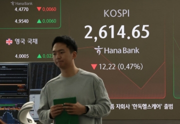 19일 서울 중구 하나은행 본점 딜링룸 현황판에 코스피 지수 등이 표시되고 있다. 이날 코스피 지수는 전 거래일 대비 13.17(0.50%) 내린 2,613.70에, 코스닥은 3.80(0.52%) 내린 721.27에 개장했다.