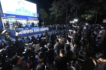 이재명 대통령 당선인이 4일 새벽 1시쯤 서울 여의도 국회 앞에 마련된 민주당 국민개표방송시청 현장에서 당선 소감을 밝히고 있다. 2025.6.4.