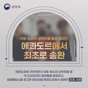 법무부는 음란사이트를 운영하면서 아동·청소년 성착취물 등 약 3,000건의 음란물을 배포하고, 성매매업소를 광고하여 수십억 원의 범죄수익을 취득한 범죄인 ㄱOO(남, 51세, 한국 국적)을 2025년 6월 12일(목) 에콰도르의 수도 키토에서 인천공항으로 송환하였습니다.
