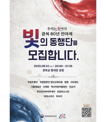 문화체육관광부는 광복 80년을 맞아 오는 14일 저녁 8시 경복궁 흥례문광장에서 국민과 함께하는 광복 80년 전야제를 개최한다고 5일 밝혔다.