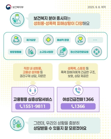 이에 복지부는 직장 내 성희롱 상담을 제공하는 노동부 고용평등심층상담서비스, 여성폭력 상담을 제공하던 여가부 여성긴급전화1366과 협력을 강화해 상담사들이 보건복지 분야의 특성을 잘 이해하고 좀 더 수월하게 보건복지 종사자 성희롱·성폭력 상담을 할 수 있도록 이달부터 복지부가 제공하는 콘텐츠를 상담사 교육에 활용할 수 있도록 협업했다.