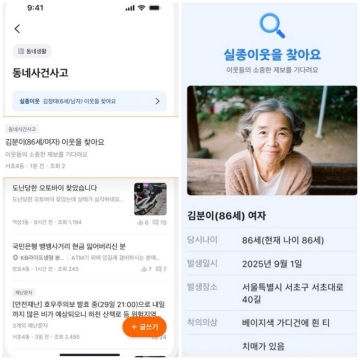 사용자 주변 실종이웃 발생 시 당근 앱 '동네생활' 게시판 자동 게재