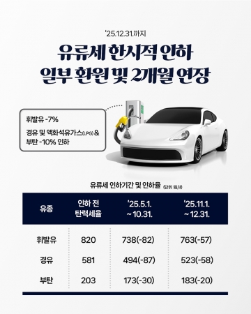'25.12.31.까지 유류세 한시적 인하 일부 환원 및 2개월 연장
