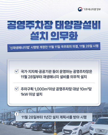 - 국가·지자체·공공기관 등이 운영하는 공영주차장은 11월 28일부터 재생에너지 설비를 의무적 설치