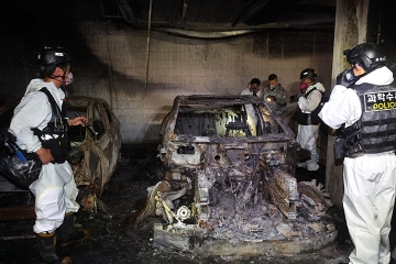인천 서구 청라 아파트 지하 주차장 화재 현장에서 경찰과 소방 등 관계자들이 합동 감식을 하고 있다.2024.8.2.(사진=연합뉴스)