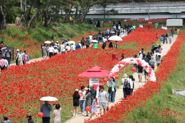 동진천변을 따라 만개한 양귀비꽃과 음악분수, 괴산교 미디어파사드 등을 즐길 수 있다.