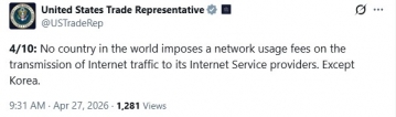 미 무역대표부(USTR)는 이날 엑스(X·옛 트위터)에 "세계 어떤 나라도 자국의 인터넷 서비스 제공업체에 인터넷 트래픽 전송에 네트워크 사용료를 부과하는 나라는 없다. 한국만 제외하고"라고 적었다.
